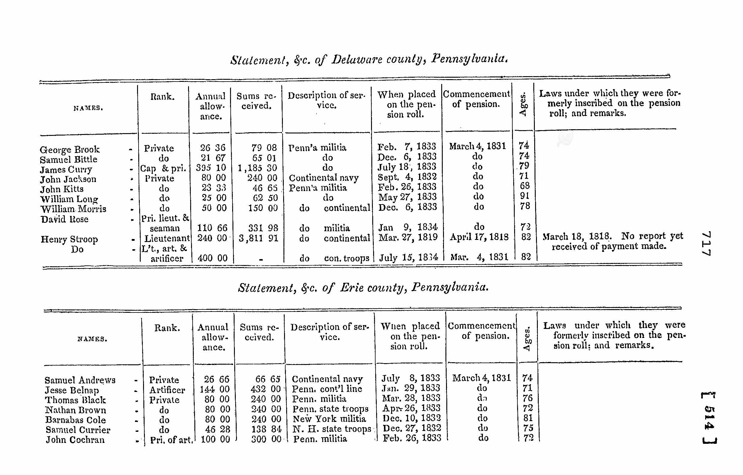 - U.S. Revolutionary War Pensioners, Pension Roll of 1835, vol. II, p. 514 (Statement of Erie County, Pennsylvania)